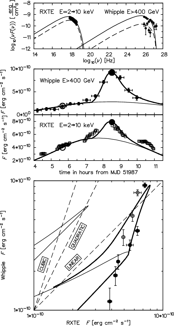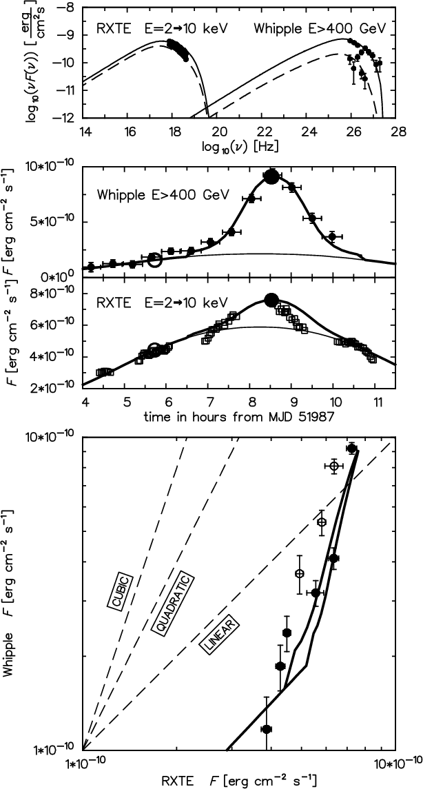 The observations show that the correlation slope is changing form linear to cubic. However, the correlations obtained for a relatively long period of the observations (weeks or moths) are usually linear or slightly more than linear (e.g. Gliozzi et al. 2006; Albert et al. 2007b), whereas the observations of short flaring events (a few hours) give quadratic or even cubic relations (e.g. Fossati et al. 2008; Aharonian et al. 2009). Moreover, a scatter of the correlated data points seems to be much higher for the long period correlations in comparison with the results obtained for the short events. The long time correlation contains observations of many different flares produced by different components of a jet, and this is probably the reason of the scatter. Therefore, the short time correlations should provide much better constraints for the emission models. Especially interesting are cases where the short time correlation is quadratic or more than quadratic. Standard one-zone models frequently used to explain the high energy emission of blazars are not able to explain such a slope of the correlation (Katarzynski et al. 2005). In the present work we propose a more complex approach, where the emission of at least two independent sources is observed at the same time.