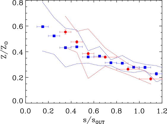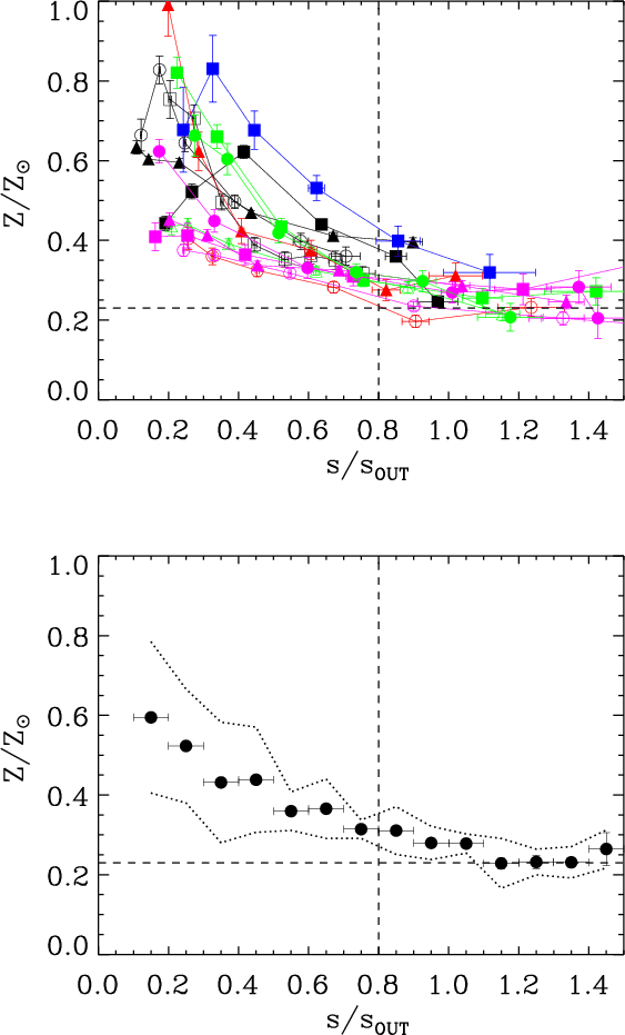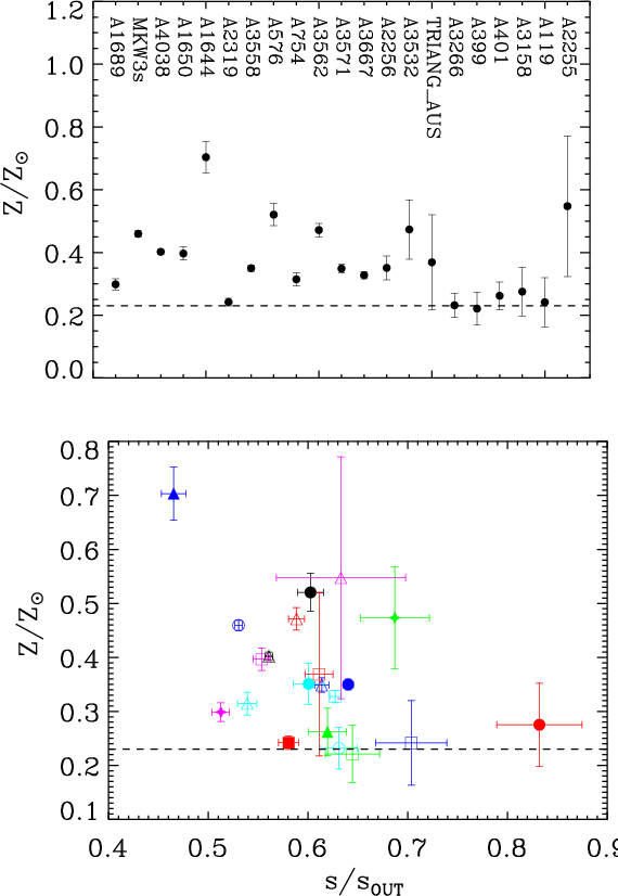 However, further analysis is needed on this result to use it to gain insight on the origin of the distribution of CC-NCC objects. We would like to characterize these regions better and to know if and to what extent they are common in the population of NCC objects. The results in Paper I as well as those described above comparing observations and simulation, are based on ``uni-dimensional'' properties (entropy and metal abundance profiles). Indeed, global properties and unidimensional profiles are easy to derive and it is possible to compare them quantitatively, but they inevitably result in a loss of information. Many thermodynamic maps are now available in the literature, which show that spherical symmetry is not generally fulfilled in clusters, and which reveal the presence of regions with ``anomalous'' characteristics outside of the cores (e.g. Rossetti et al. 2007; Sun et al. 2002, and many others).