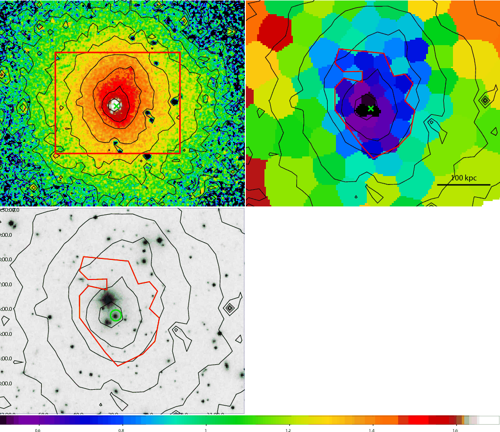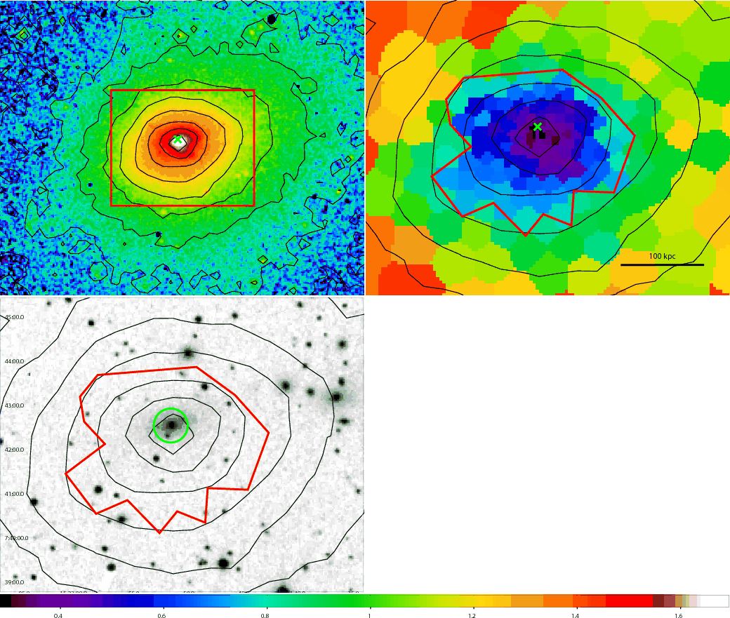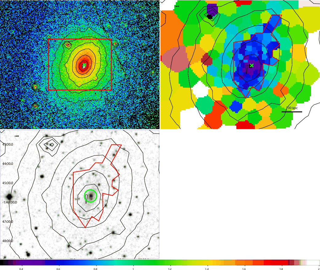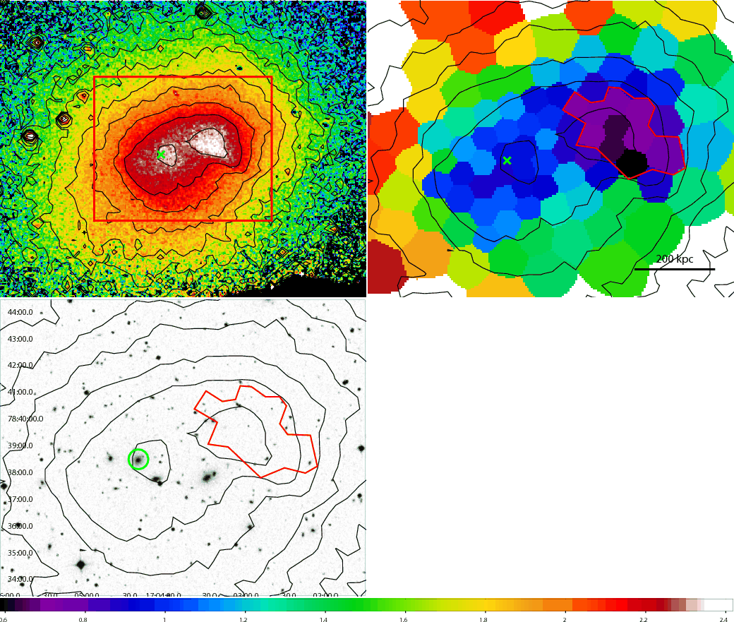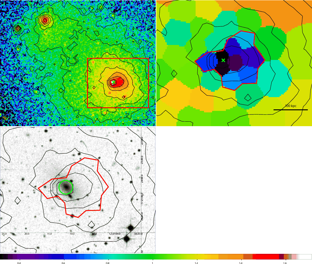 Figure B.2: MKW3s. Upper left panel: X-ray flux image. Upper right panel: pseudo-entropy ratio map (zoom), with X-ray contours overlaid. Lower left panel: optical image (zoom), with X-ray contours overlaid. The red box in the first panel marks the region zoomed in in the other two panels. The red polygon in the other two panels is the contour of the ``CC-remnant'', i.e. it marks the bins where the pseudo-entropy ratio is <0.8. The green circle ( lower left) and ``X'' mark the position of the BCG. The scale refers to the pseudo-entropy ratio map. |
