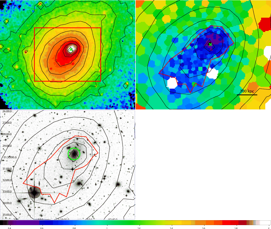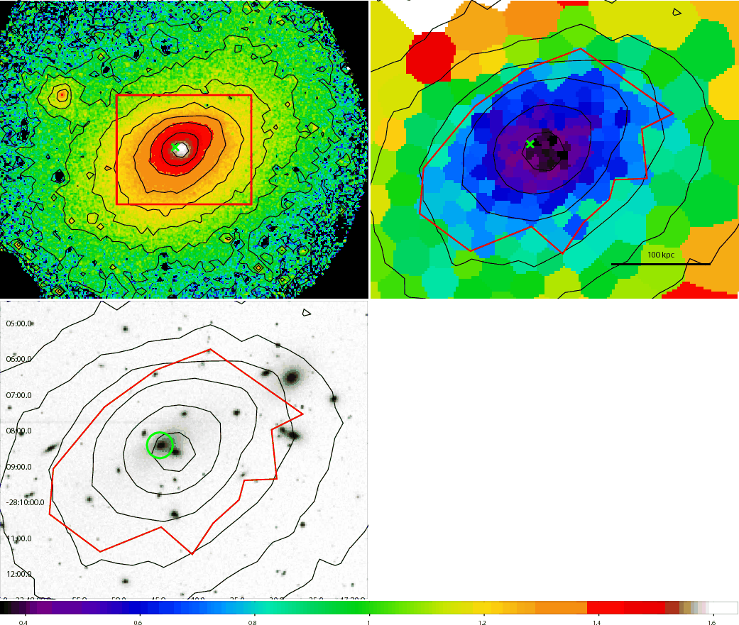 Figure B.10: Abell 3571. Upper left panel: X-ray flux image. Upper right panel: pseudo-entropy ratio map (zoom), with X-ray contours overlaid. Lower left panel: optical image (zoom), with X-ray contours overlaid. The red box in the first panel marks the region zoomed in in the other two panels. The red polygon in the other two panels is the contour of the ``CC-remnant'', i.e. it marks the bins where the pseudo-entropy ratio is <0.8. The green circle ( lower left) and ``X'' mark the position of the BCG. The scale refers to the pseudo-entropy ratio map. |