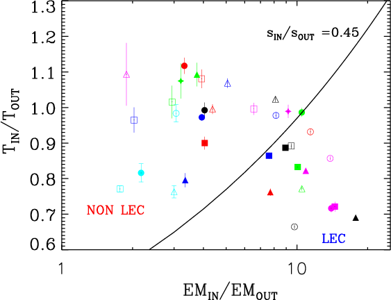 categories: e.g. temperature drop (Sanderson et al. 2006,2009b), cooling time (Bauer et al. 2005), a composition of these two criteria (Dunn & Fabian 2008; Dunn et al. 2005), the slope of the gas density profile at a given radius (Vikhlinin et al. 2007) and core entropy (Cavagnolo et al. 2009). In a recent paper (Leccardi et al. 2010, hereafter Paper I), we suggested a robust indicator to classify clusters (see also Sect. 3),