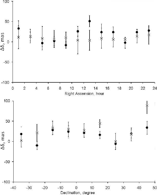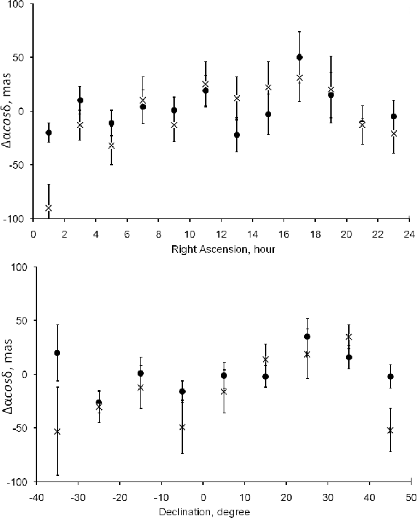 Figure 6: Differences (O-R) in declination as a function of right ascension and declination (circles UCAC2 data, crosses 2MASS data) for 124 common ERS. |