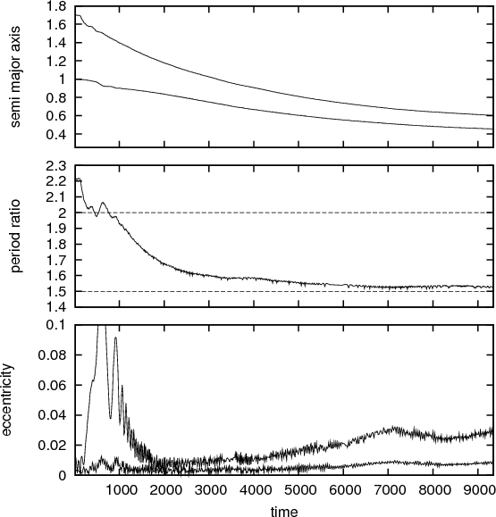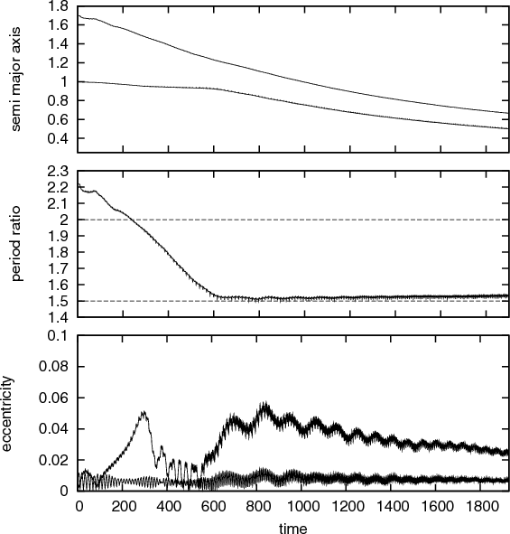 It is then usually assumed that migration due to planet disc interactions has moved the planets closer to the star. Although the details of this process are still being hotly debated, the existence of many resonant multiplanetary systems supports this idea. During migration the planets can get locked into a commensurability, after which the planets migrate together with a constant orbital period ratio. In such a resonance, one or more resonant angles are librating (see e.g. Lee & Peale 2001).