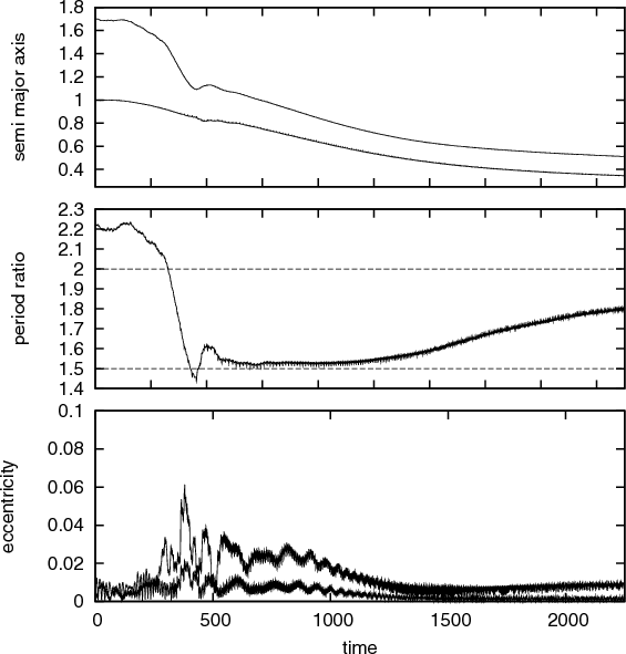 Pierens & Nelson (2008) have studied a similar scenario where the goal was to resemble the 3:2 resonance between Jupiter and Saturn in the early solar system. They also find that the 2:1 resonance forms in early stages; however, in their case the inner planet had the higher mass, whereas the planetary system that we are considering has the heavier planet outside. In their situation the 2:1 resonance can be unstable, enabling the formation of a 3:2 resonance later on, and the migration rate may stall or even reverse (Masset & Snellgrove 2001).