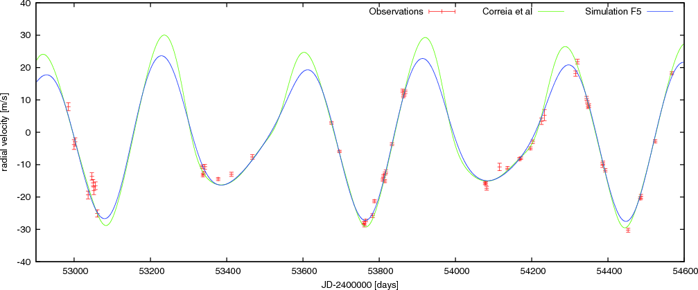 The results are shown in Fig. 7. The blue curve corresponds to the outcome of simulation F5 and we list the orbital parameters in Table 2. We also plot the best fit given by Correia et al. (2009) for comparison (green curve). In accordance with the discussion given above, it is very difficult to see any differences in the quality of these fits, which indeed suggests that the models are statistically indistinguishable.