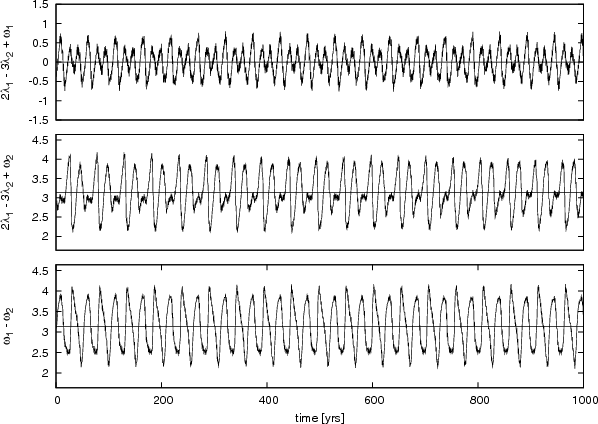 This in turn results in a different libration pattern: the slow libration mode (see Fig. 3a in Correia et al. 2009) that is associated with oscillations of the angle between the two apsidal lines is absent, as shown in Fig. 9. Thus there is a marked difference in the form the interaction between the two planets takes in the case of this fit.