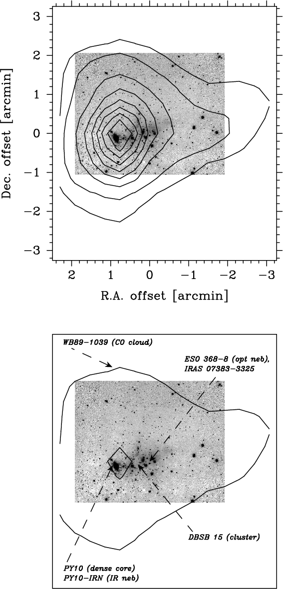 Optical examination of the Palomar and ESO plates (Brand et al. 1986) did not find any evidence of obscuration towards ESO 368-8. Thus, the molecular nature of this SFR was first revealed in the CO survey of Wouterloot & Brand (1989) in their survey of IRAS sources beyond the solar circle, where IRAS 07383-3325 is listed as a good detection (No. 1039). We refer to this molecular cloud as WB89-1039, first mapped and probed by us using millimetre spectra, and presented here in Sect. 3.2.