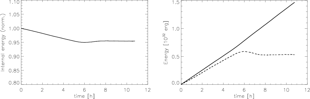 The steady decrease of the total internal energy in the computational box shown in Fig. 3 (left panel) clearly indicates that the sytem is not relaxed until about 6-7 h after the start of the simulation. Comparing the time-integrated total radiative output from the box with the integrated decrease of the total internal energy given in the right panel of Fig. 3 suggests that during the first half of the evolution the energy output was mostly covered by a loss of internal energy, i.e., the plasma in the box cooled. Only after about 6 h, the two curves start to diverge and the internal energy does no longer decrease. At about the same time, the slope of the integrated energy output steepens, indicating a somewhat higher energy output. This is confirmed by Fig. 4 (left panel), which shows that the total radiative flux is higher by about 10% in the second half of the run.