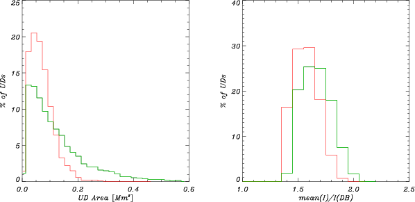 | Figure 8: Histograms of UD area ( left) and mean bolometric brightness ( right, normalized to the average DB) for all segmented maps. Red and green curves refer to datasets P1 and P2, respectively. |