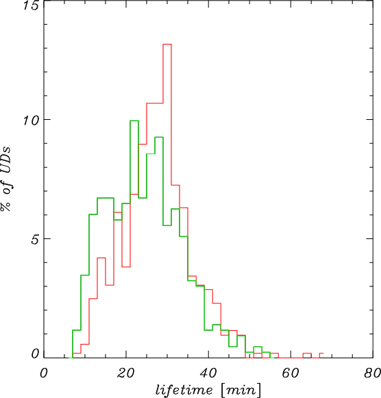 - Lifetime: average lifetimes for the simulated UDs are 28 min (P1) and 25 min (P2). Reported lifetimes from observations vary significantly, but recent high-resolution data typically indicate shorter lifetimes, although long-lived UDs are also found. It is possible that the simulations, owing to limitations in spatial resolution, miss a population of small, short-lived UDs.