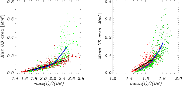 Figure 11: Relation between area and brightness for the same set of UDs as in Fig. 10. Left: scatter plot of maximum area vs. maximum (normalized) bolometric brightness during the lifetime of an UD; Right: scatter plot of mean UD area (over UD lifetime) vs. mean area-averaged brightness (over UD lifetime). Red and green color refers to datasets P1 and P2, respectively; solid black (P1) and blue (P2) lines connect binned values for 50 points each. |