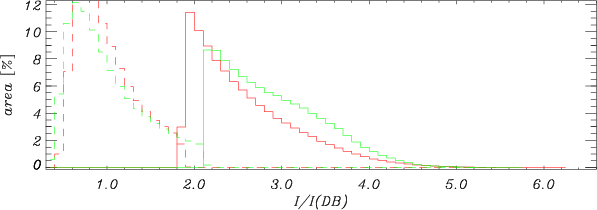 Figure 12: Area histograms of the continuum intensity at 630 nm. Solid curves refer to UDs, dashed curves to DB. Red and green curves indicate datasets P1 and P2, respectively. |