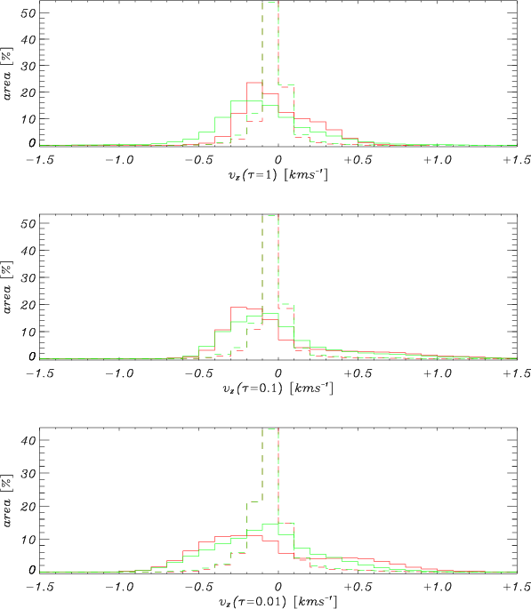 Figure 7: Area histograms of bolometric intensity ( upper panel) and vertical field strength ( lower panel). The field strength is given taken at z=0, corresponding to the average geometrical height level of Rosseland optical depth unity. Solid curves refer to UDs, dashed curves to DB. Red and green curves indicate datasets P1 and P2, respectively. |