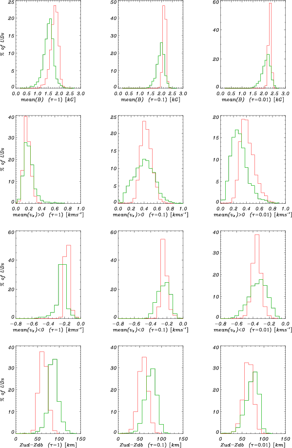 For the full datasets P1 and P2, Fig. 7 shows area histograms of the bolometric intensity and the vertical component of the magnetic field at constant height z=0, which corresponds to the mean level of Rosseland optical depth unity. Histograms for UDs and DB are given separately (including all image pixels belonging to each class). The UD intensity distributions reflect the fact that UDs tend to be brighter in P2. The tail of DB intensities overlapping with the UD distribution results from the ``trenches'' generated by the MLT algorithm to separate closely neighboring or clustered UDs and the exclusion of the faintest UDs.
