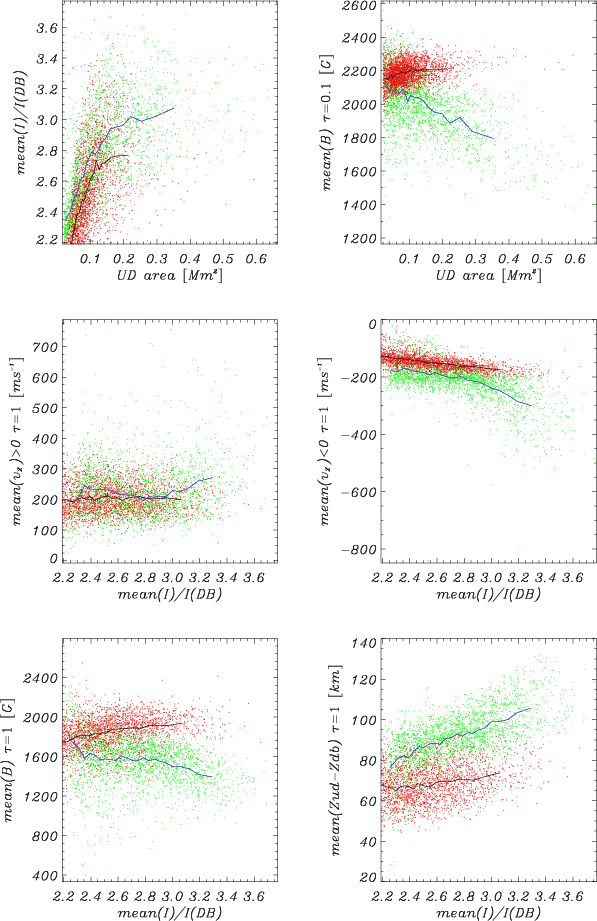 The relations between various mean quantities for the full set of UDs found by segmentation of continuum images at 630 nm are illustrated by scatter plots in Fig. 18. The positive correlation between UD area and brightness seen in Fig. 11 (for bolometric brightness) is confirmed also for 630 nm (top left panel). Although there is a large amount of scatter, UDs from P2 tend to be brighter for the same area, possibly reflecting higher upflow speeds (below optical depth unity) with a higher convective energy flux.