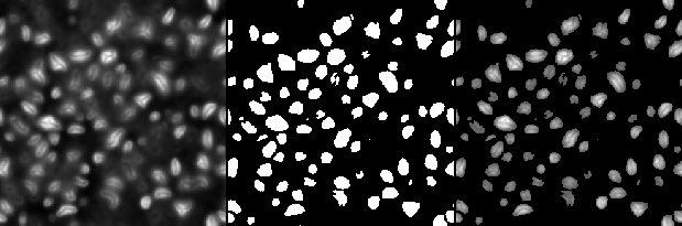 Figure 2: Result of the MLT image segmentation. Left: original image; middle: segmented image (binary map); right: segmented umbral dot areas with their original intensities. |