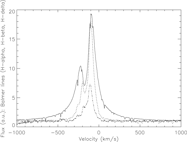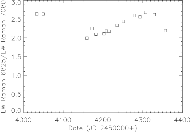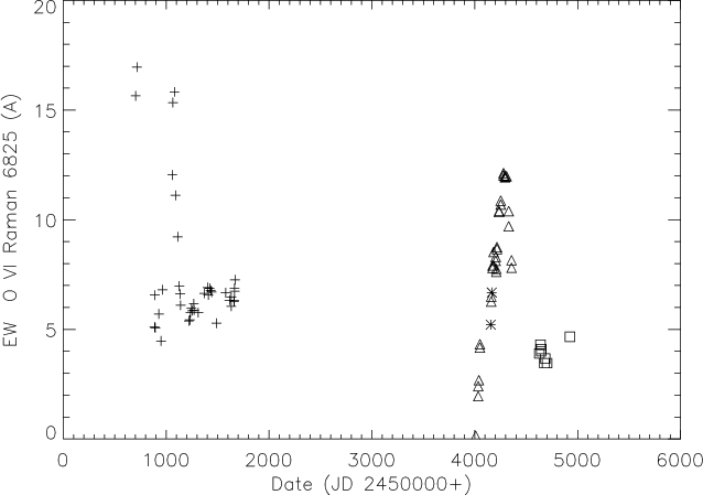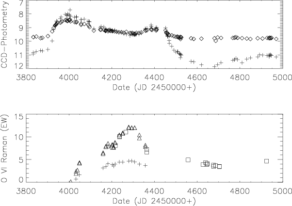 AcknowledgementsResearch at Loiano is supported by INAF. P.K. was supported by ESA PECS grant No. 98058. G.M.W. acknowledges support from NASA grant NNG06GJ29G. We thank the staff at Loiano for their kind help in obtaining many of the spectra used in this study as a service observing program and U. Munari, C. Rossi, and R. Viotti for use of unpublished spectra. Some spectra at Ondrejov were taken by M. Netolický, B. Kucerová, V. Votruba and D. Korcáková. M.W. was supported by the Research Program MSM0021620860 of the Ministry of Education of the Czech Republic. A.S. was supported by a grant of the Slovak Academy of Sciences No. 2/7010/27. We thank T. B. Ake for collaboration on the FUSE proposal that began this observation, unfortunately not executed before the end of the mission, and for his advice on the FUSE data, and J. P. Aufdenberg, C. Rossi, and R. Viotti for valuable discussions.The HST/STIS and FUSE spectra were obtained from the MAST archive of STScI and archival visual photometric data were provided by the AAVSO.