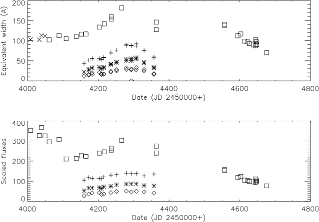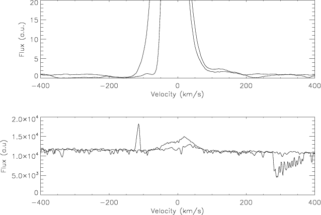 the weak line occurred at the last epoch. Notably, BEFS and FUSE detected P Cyg components from the K star wind whenever the broad line was strong. One HST/STIS Ly