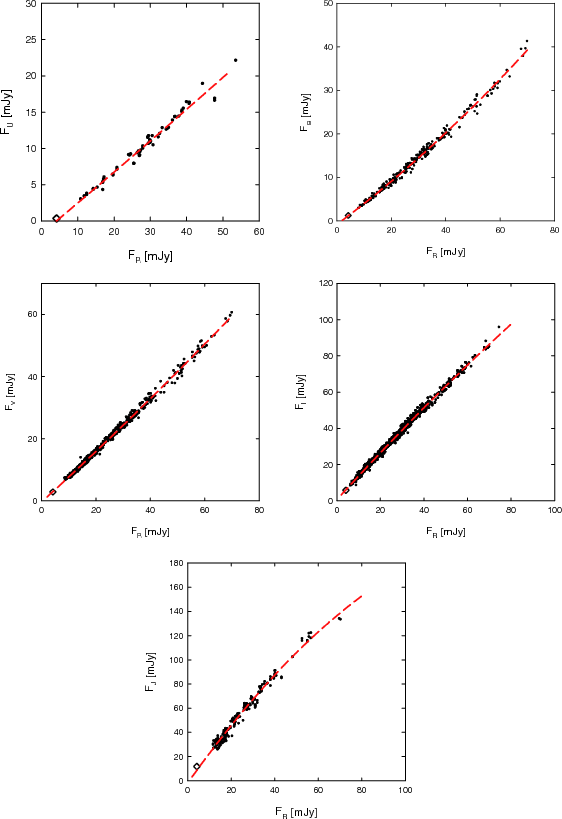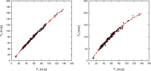 Figure 3: De-reddened flux-flux dependences in the optical-NIR region. The red lines represent second-order polynomial regressions. Diamonds correspond to the position of the underlying galaxy. |