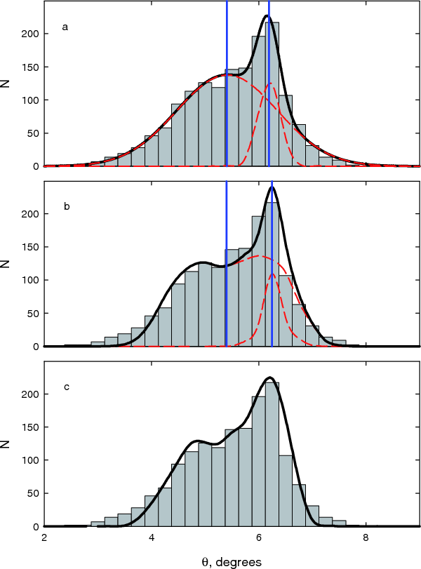 Figure 7: Two-dimensional distributions of angles, corresponding to the three different interpretations of the histogram in Fig. 6. |