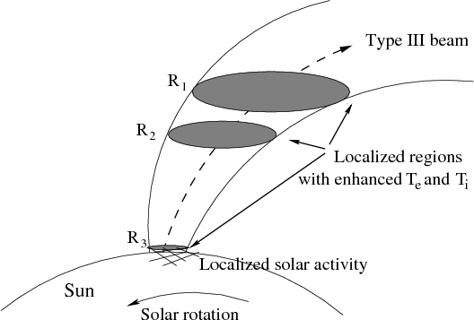 Figure 1: Illustration of the production of localized regions with enhanced coronal temperatures in an open magnetic flux tube, through which a type III beam propagates (viewed from above the north pole). Localized regions R1-R3 are caused by three separate episodes of activity at localized solar source, with the latest activity producing R3. For clarity, the flux tube is assumed to have a regular spiral shape. |