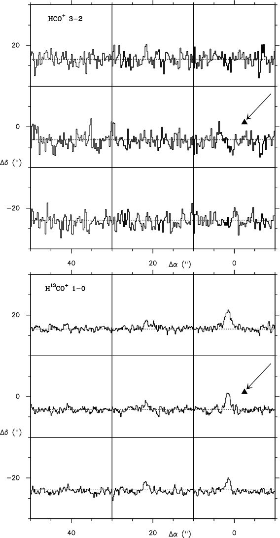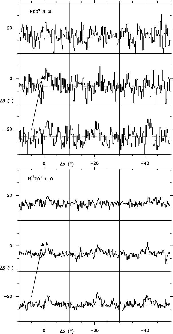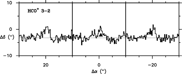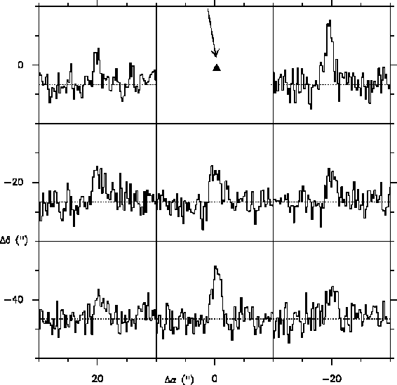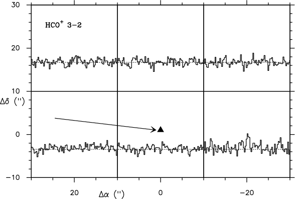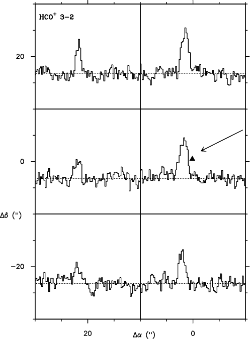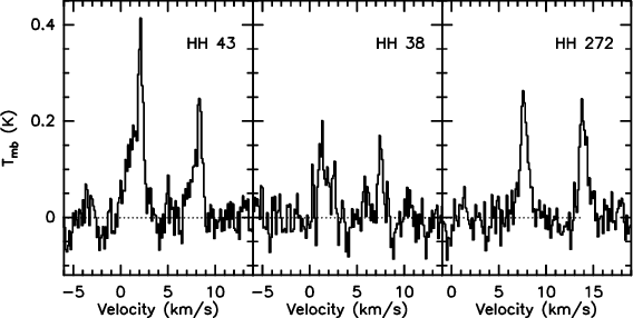 Figure 13: Spectra of the CH3OH (2n-1n) ahead of HH 43, HH 38 and HH 272, observed with SEST. The offset positions for these spectra are (0'', -50''), (0'', 10'') and (0'', 0''), respectively. |