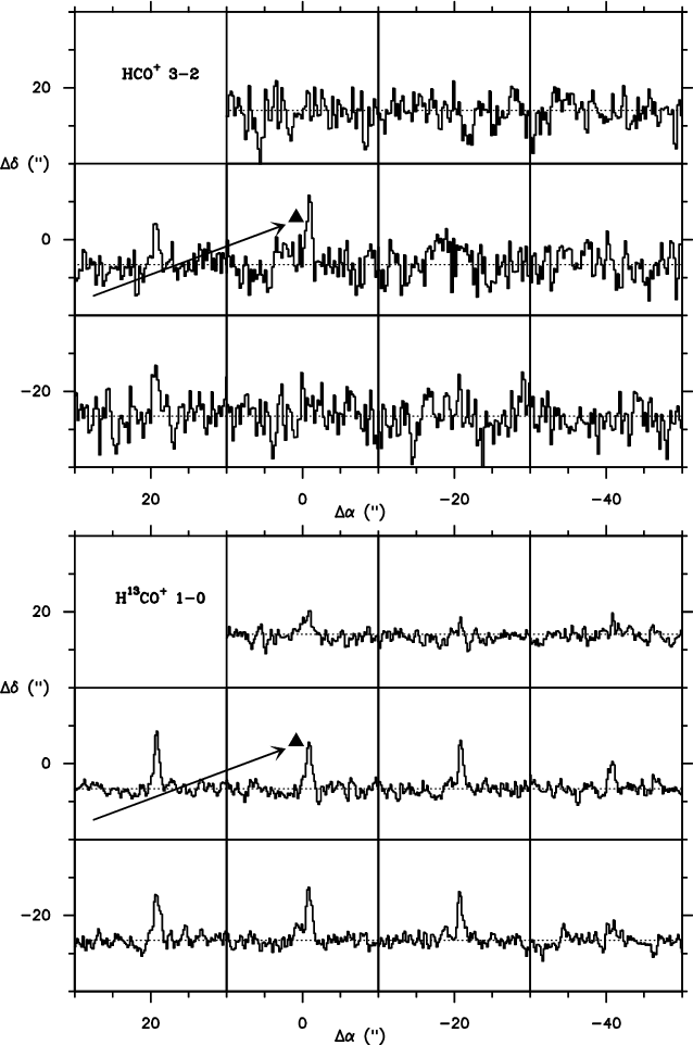 In Sect. 2 we describe the HCO+ observations made in the HH objects, and in Sect. 3 we give the results of the data obtained. In Sect. 4 we give a brief discussion of clumpiness deduced from these observations of HCO+ emitting condensations near HH objects, and make some conclusions about the nature of clumpiness in molecular clouds that contain HH objects.
