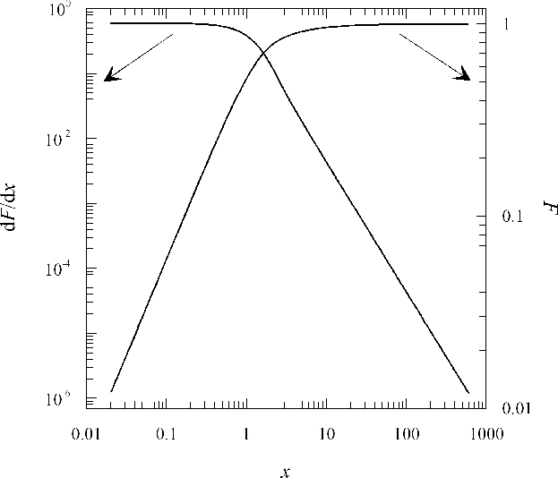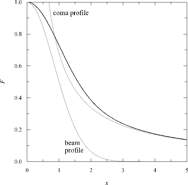 Figure 1: Loss of the normalized flux F due to a relative pointing offset x (measured in units of the beam radius at half-power). The dependence was derived for our model coma (further described in Sect. 4.1) and for the assumed beam pattern (see Eq. (1)), both profiles being shown for comparison. |
