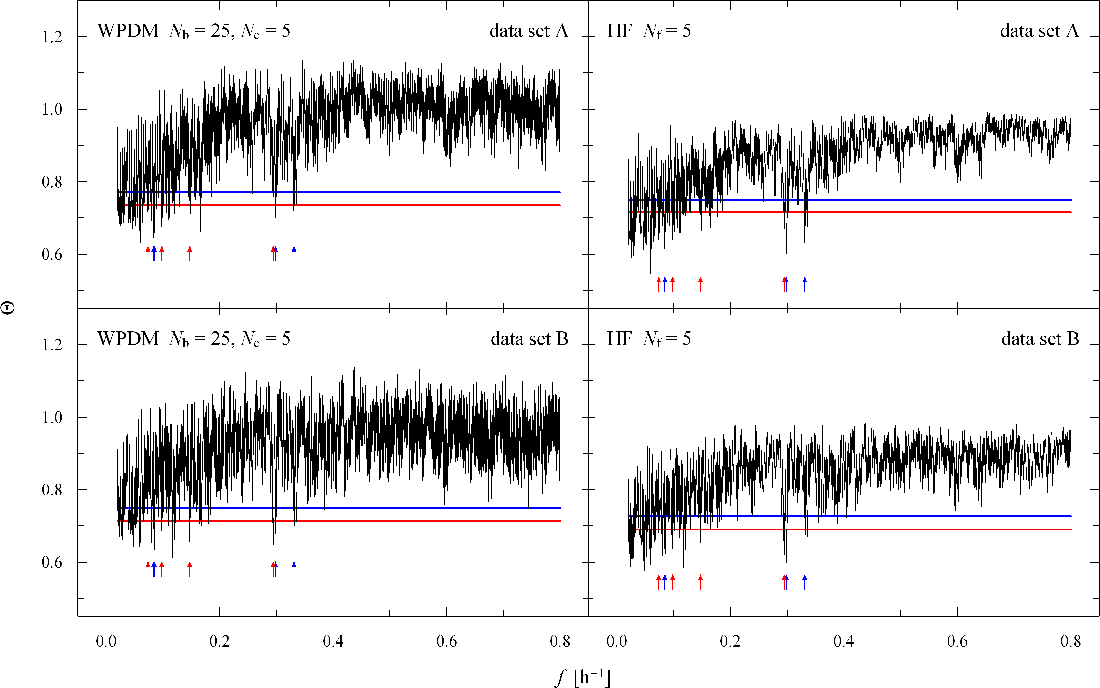 Figure C.2: Periodograms for our two test data sets (described in the text) calculated with both methods. The horizontal lines indicate the confidence levels of 75% (blue) and 95% (red). Positions of the eight best solutions (see Table 2) are indicated by the arrows: red for those from the system and blue for the others. Solutions B and C are barely resolved in this figure. |