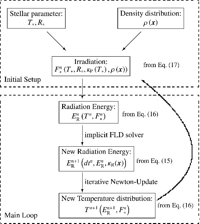 AcknowledgementsThis research has been supported by the International Max-Planck Research School for Astronomy and Cosmic Physics at the University of Heidelberg (IMPRS-HD). Special thanks goes to Fabian Janssen for benchmarking different hydrodynamics codes on the PIA cluster during summer 2007. R. Kuiper would like to thank Gerhard Hoffmann for his permanent helpful suggestions and the discussions about numerical details, especially the parallelization, of the developed radiation transport module as well as Jürgen Steinacker for helpful conversation about the radiation benchmark test of Pascucci et al. (2004). Author R. Kuiper further thanks A. Mignone for the main development of the open source magneto-hydrodynamics code Pluto as well as his great support in code specific questions. Authors H. Klahr, C. P. Dullemond and W. Kley have been supported in part by the Deutsche Forschungsgemeinschaft DFG through grant DFG Forschergruppe 759 ``The Formation of Planets: The Critical First Growth Phase''. Parallel performance tests have been performed on the rio cluster of the Max Planck computing center in Garching.
