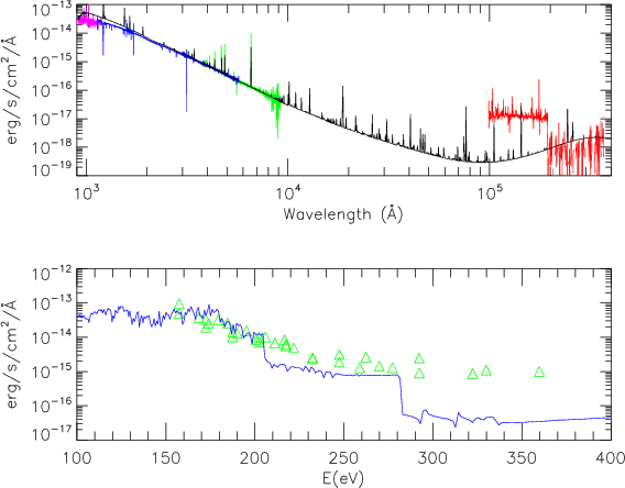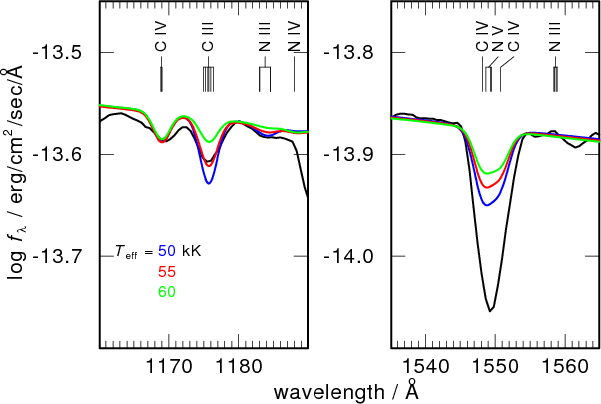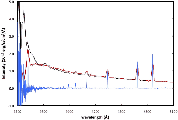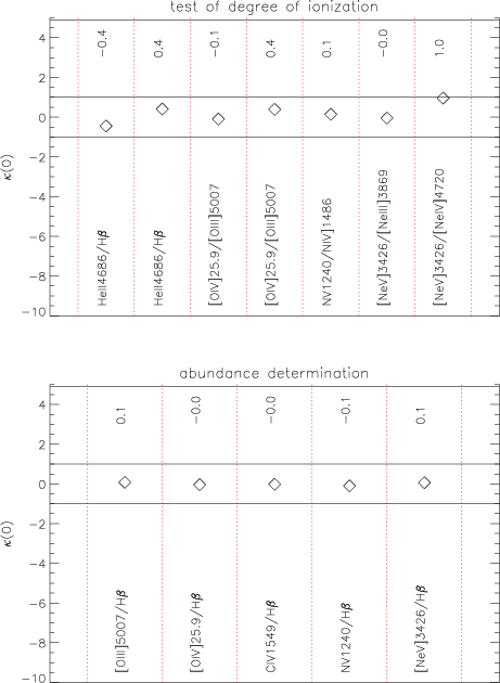- This treatment was applied well before we had understood that the optical continuum was dominated by a star of 55 kK (see Sect. 3.3). In view of the fact that the lines we use for the dignostics discussed in the present paper are hardly affected by this correction, we decided not to redo the subtraction using more adequate model stellar spectra.