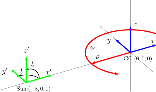 Figure B.1: Overview of the Galactic coordinates. The Sun is found at (x,y,z)=(-8,0,0). l and b are the Galactic sky coordinates. |