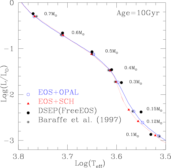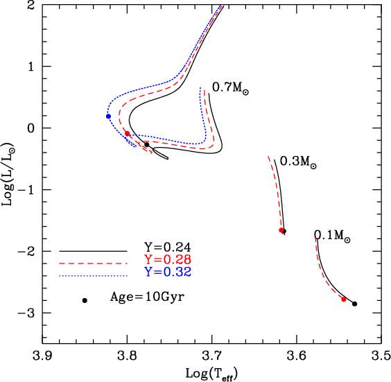 the OPAL EOS. Models consider different initial helium and
