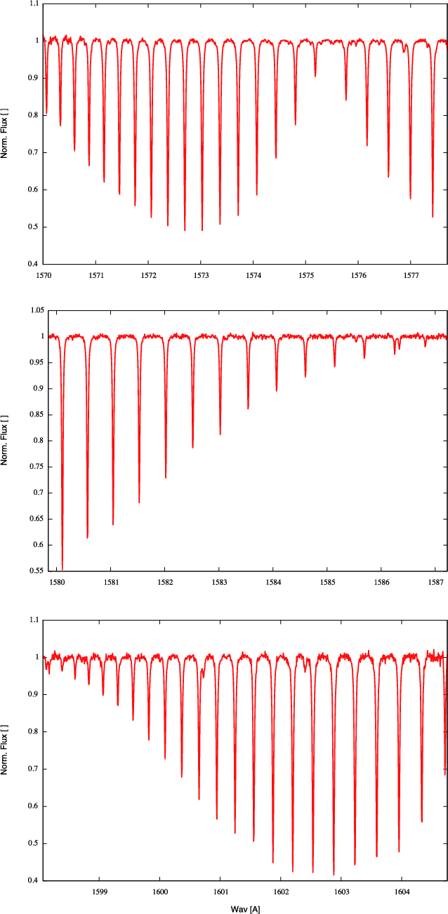 Several notable experiments on the use of atmospheric absorption features were made in the eighties, of which we highlight the results of Balthasar et al. (1982), Smith (1982), and Caccin et al. (1985). Working with O2 lines, these authors could reach a precision of 5 m/s. The value is made even more relevant by their using different RV determination methods (different instrumentation, different line fitting approaches, etc.), now believed to be obsolete when compared with the cross correlation function (Baranne et al. 1996) or the deconvolution method. Snellen (2004) used the same principle on H2O lines and reached a precision of 5-10 m/s on UVES data. This shows that the accuracy of our wavelength reference is at least of 5 m/s, making it a valuable option for us.