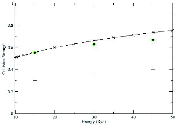 Aggarwal & Keenan (2005) also draw attention to the increasingly large differences in thermally averaged collision strengths between their work and that of Gupta & Tayal (1998) as the electron temperature is reduced. In Fig. 9 we compare our results with those of both Aggarwal & Keenan (2005) and Gupta & Tayal (1998) for the transitions among the levels of the lowest 3s2 3p3 configuration at 105 K. The differences between all three calculations are significantly larger than those found at the higher temperatures but no clear picture emerges. The average absolute percentage difference between our results and those of Gupta & Tayal (1998) is 19% while for Aggarwal & Keenan (2004) it is 21%. The maximum differences are 43% and 44% respectively. The lower the temperature, the more the thermally averaged collision strengths depend on a few near threshold resonances, the uncertainty in the positions of which becomes increasingly important. It is our view that the scatter in the results at 105 K is a measure of the real uncertainty in the published low temperature results at present. Further work is needed to examine the convergence of the low temperature thermally averaged collision strengths as target size is increased.