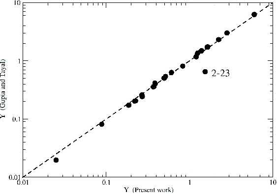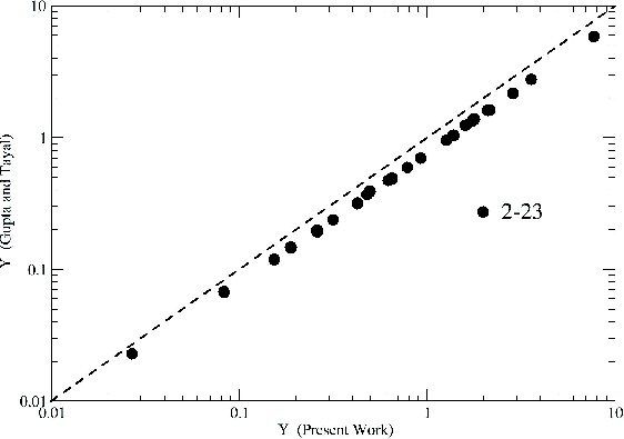 In Figs. 6-8 we compare our results with those of Gupta & Tayal (1998). We begin by comparing thermally averaged collision strengths at 106 K for those transitions which correspond to strong optically allowed transitions, in practice those which satisfy the rigorous selection rules and also conserve the spin quantum number of the ion. This comparison is shown in Fig. 6. With the exception of transition 2-23, which appears to be a typographical error in the paper of Gupta & Tayal (1998) the agreement is excellent.