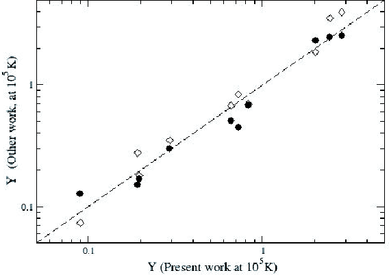 Figure 9: Comparison of thermally averaged collision strengths at 105 K from the present work and from Gupta & Tayal (1998) (filled circles) and Aggarwal & Keenan (2004) (open diamonds). Transitions are included between the five energetically lowest levels. |
