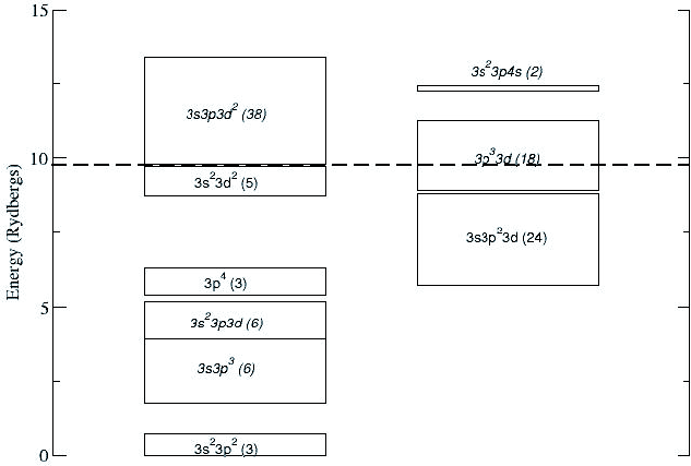 For these two reasons it is important that all levels of the 3p4, 3s3p23d and 3s23d2 configurations are included in the close coupling expansion for the scattering process. The dashed line in Fig. 1 shows the extent of the target in our calculation, which comprises 54 LS terms and 114 levels. Other configurations of the n=3 complex are included in the expansion of the target wavefunctions and these are discussed further in the next section.