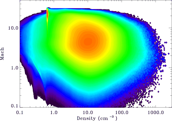Figure 1: Maximum density values along the lines of sight at one time step of the 12003 2-phase simulation. The brighter spots correspond to a density exceeding 100 cm-3 embedded into a pervasive material at a density of a few cm-3. |