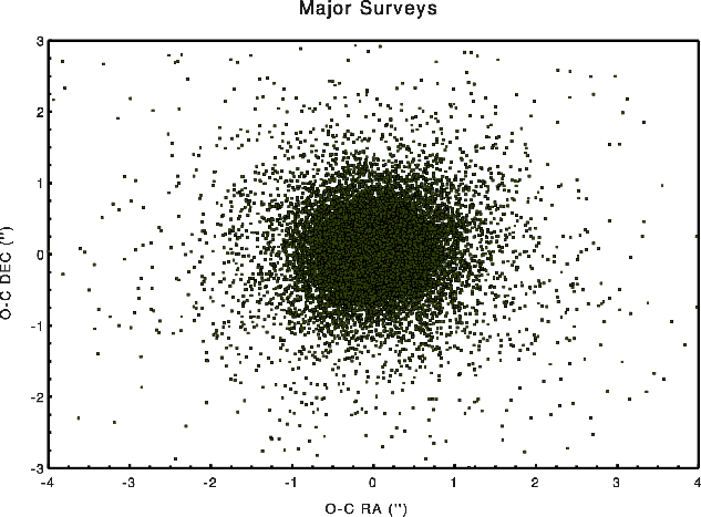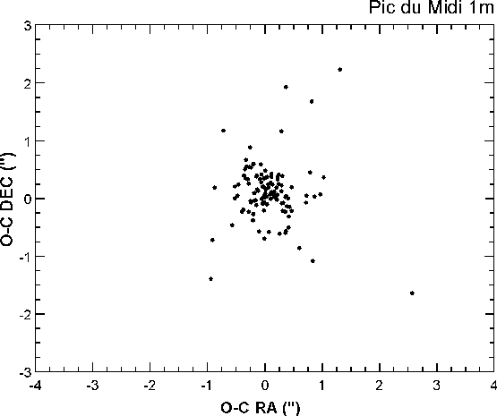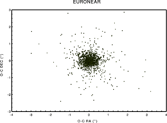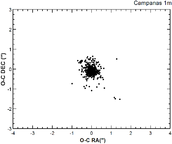 Figure A.1: Pic du Midi 1 m: (o-c) residuals for 122 positions of 14 NEAs observed by EURONEAR in one run. |
