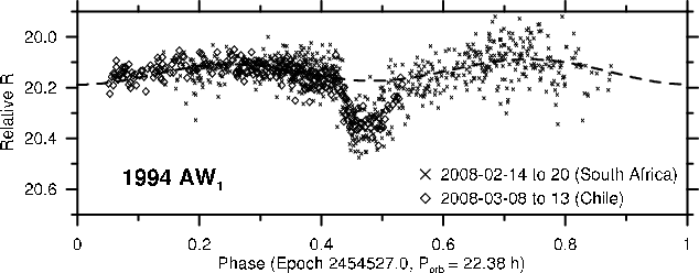 Figure 7: Composite lightcurve of the binary system 1994 AW1 after subtraction of the short period. The dashed line is the assumed fit of the lightcurve, which does not cover the whole period. |
