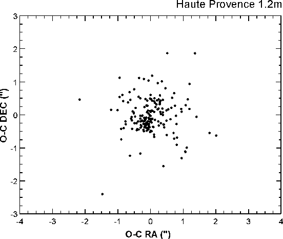Figure A.2: Haute Provence 1.2 m: (o-c) residuals for 171 positions of 19 NEAs observed by EURONEAR in one run. |
