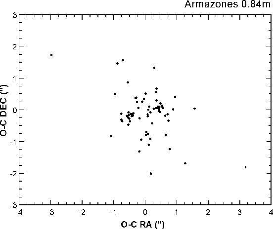 Figure A.3: Armazones 0.84 m: (o-c) residuals for 73 positions of 6 NEAs observed by EURONEAR in one run. |
