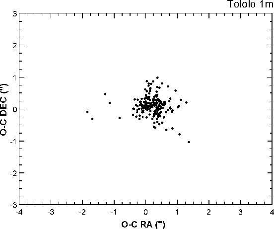 Figure A.4: Tololo 1 m: (o-c) residuals for 207 positions of 24 NEAs observed by EURONEAR in one run. |