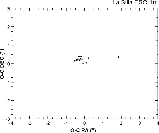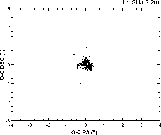 Figure A.7: La Silla 2.2 m: (o-c) residuals for 165 positions of 15 NEAs observed by EURONEAR in one run. |