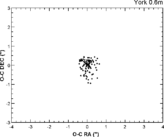 Figure A.9: York University 0.6 m: (o-c) residuals for 98 positions of 4 NEAs observed by EURONEAR in 4 runs. |