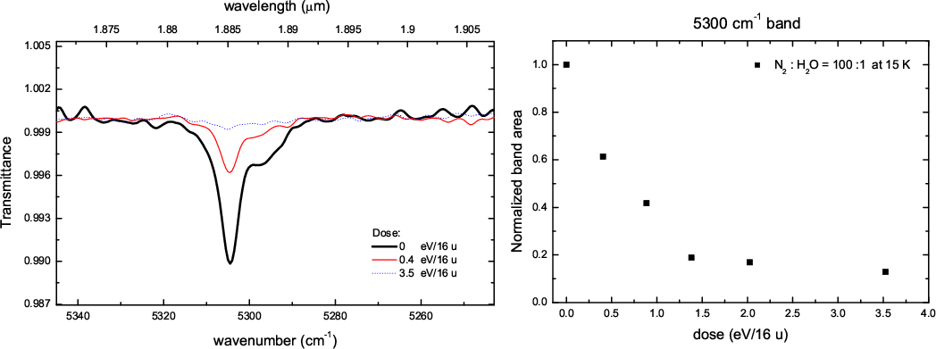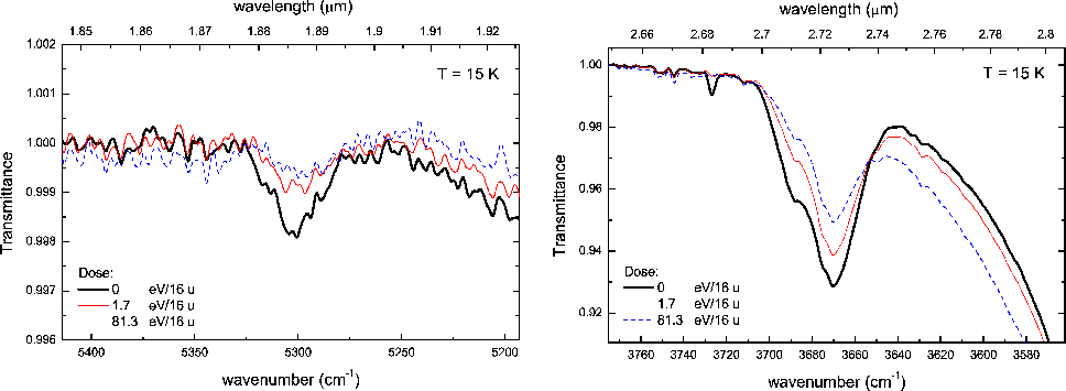 m bands depend on the initial mixture water is embedded in. The intensity of these bands decreases after ion irradiation.