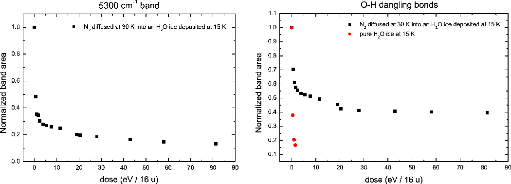 temperature-related diffusion processes of solid N2 into H2O ice deposited at different temperatures. Finally, we analyse ion irradiation effects for some of the mixtures considered.