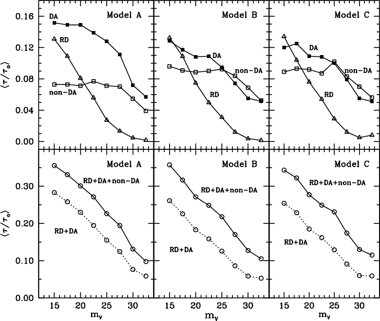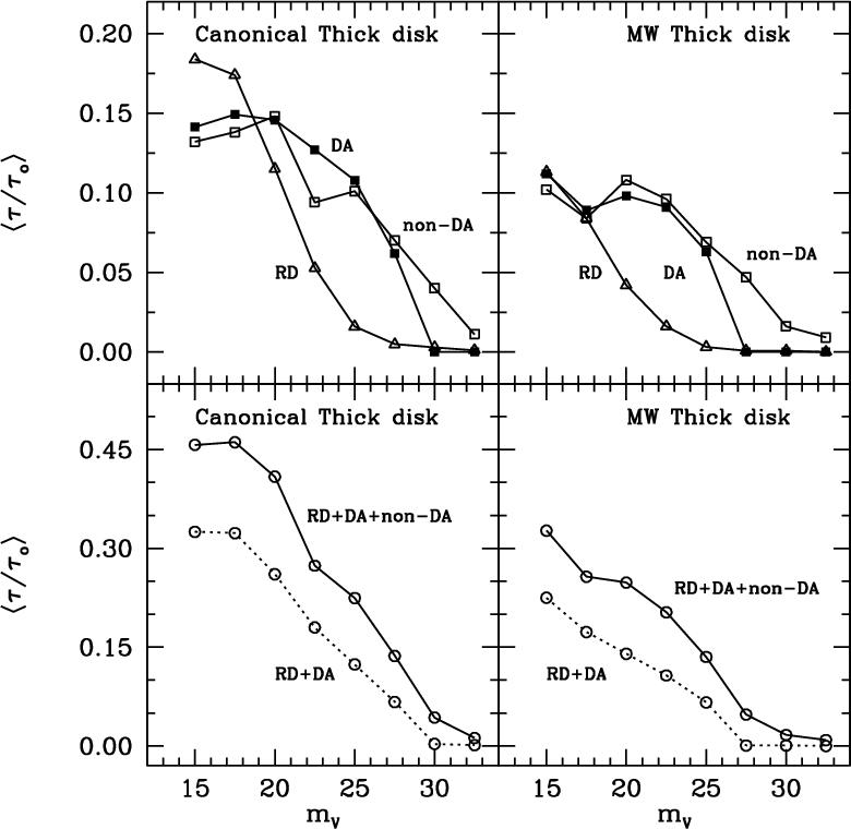 Finally, we found that when both the halo and the thick disk populations are considered, nearly half of the measured value of the microlensing optical depth towards the LMC can be explained at the 95% confidence level by our simulated halo and thick disk populations. According to our simulations, the fraction of halo dark matter that can be expected from MACHOs increases moderately (to f = 0.06) with respect to our previous simulations when hydrogen-deficient white dwarfs are taken into account.