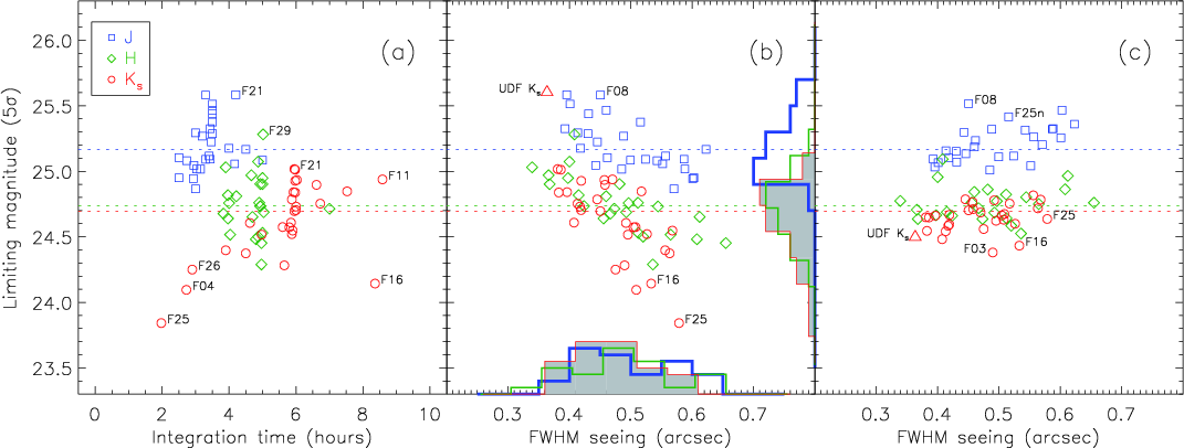 bands, respectively. For point sources total limiting magnitudes of J=25.0, H=24.5, and